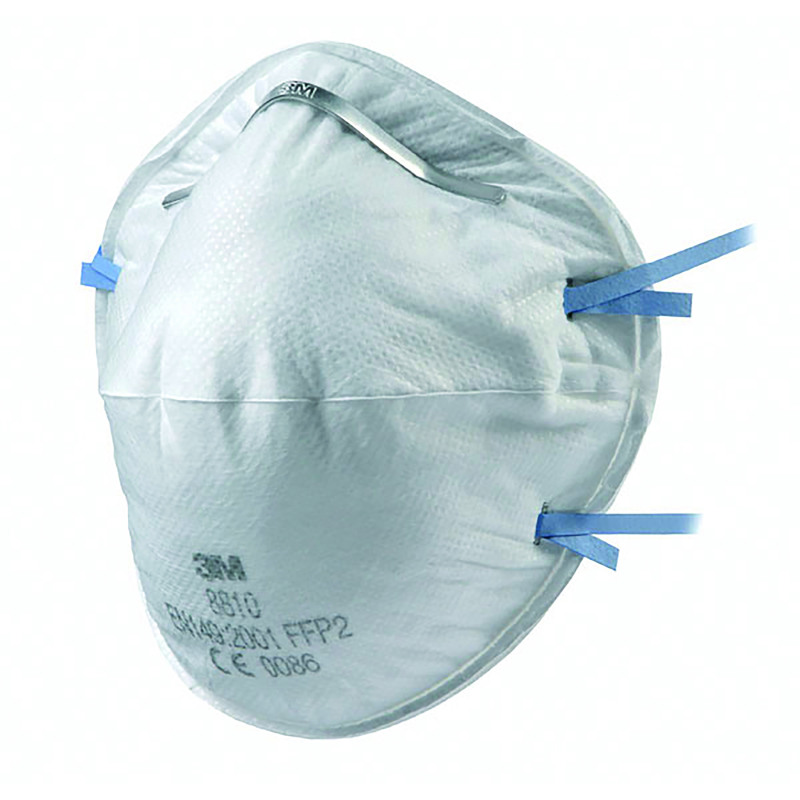 3M 8810 Cup-Shaped Respirator - FFP2 Provides respiratory protection against moderate levels of fine dusts and mists.Additional Information * Reliable, effective protection against fine particulates* Durable collapse resistant inner shell* Excellent fit over a wide range of face sizes provided by convex shape, nose clip and twin-strap design* Comfortable, lightweight off-the-face design* Blue colour coded straps denoting FFP2 protection level.Standard: EN149:2001 FFP2Approval: CE MarkedMaximum use level: Assigned Protection Factor: 10 x WEL (Nominal Protection Factor 12 x WEL)